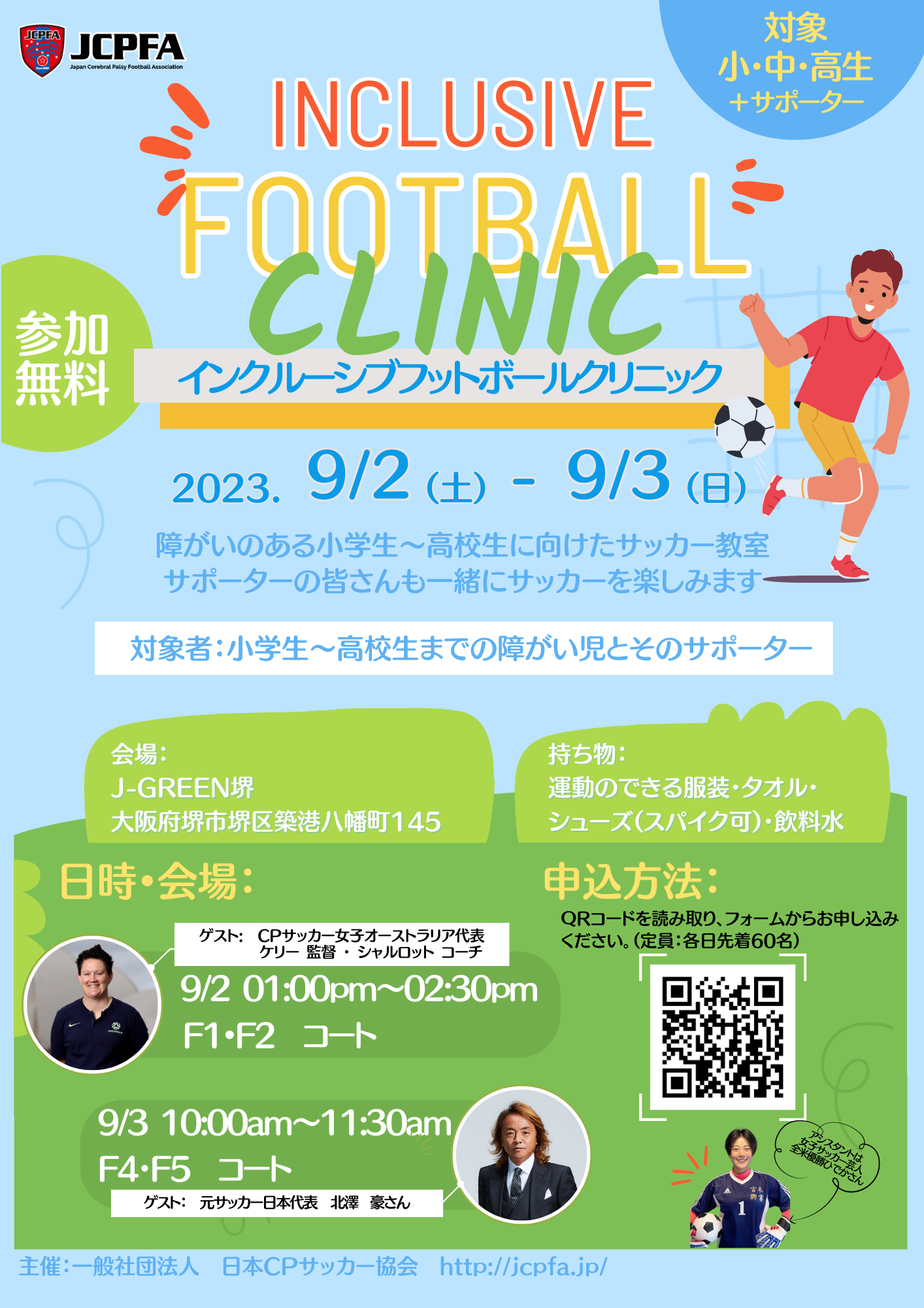 9月2日(土)・9月3日(日)に、「インクルーシブフットボールクリニック」を、J-Green堺(大阪府堺市)にて開催します!